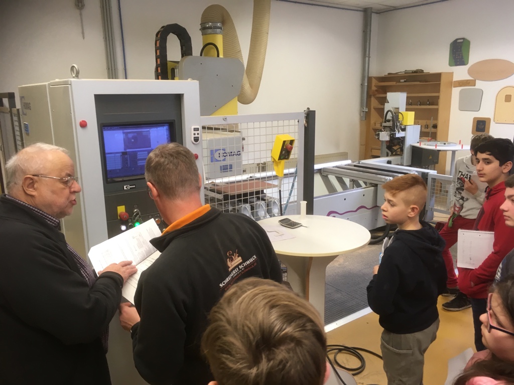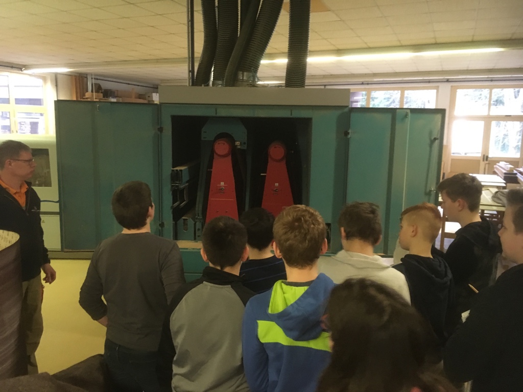 Kaum angekommen, wurden wir vom Tischlermeister Jörg Schwieck selbst empfangen und erhielten einen interessanten Rundgang durch die Firma. Viele Informationen zu den Maschinen waren verblüffend. So gibt es eine Schleifmaschine, die so dünne Schichten abtragen kann, als ob man die Druckerschwärze von einer Zeitung abheben möchte!