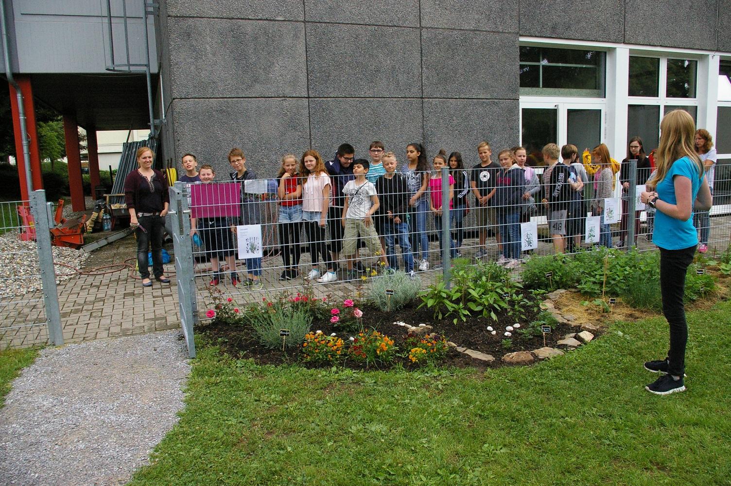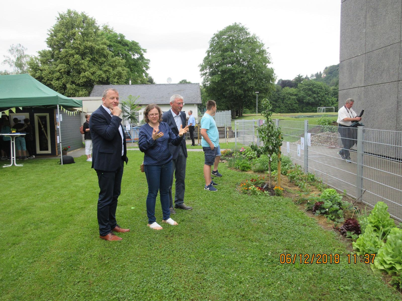 Die einst dürre und unfreundliche Grasebene verwandelte sich in einen grünenden Garten und war am bundesweiten Tag des Schulgartens, dem 12. Juni, kaum wieder zu erkennen! Zur feierlichen Eröffnung waren hohe Gäste angereist: Frau Dr. Goldschmidt, die Beauftragte des Ministeriums für Umwelt, Energie, Ernährung und Forsten in Mainz, der Landrat des Rhein-Lahn-Kreises Frank Puchtler und der Bürgermeister der Stadt Lahnstein Adalbert Dornbusch, der dem Schulleiter Herrn Norbert Hißnauer einen Spendenscheck für die weiteren Gartenarbeiten überreichte. Alle Gäste betonten, wie wichtig der Lernort Schulgarten für die Stärkung des Umweltbewusstseins der jungen Menschen und ihre engere Bindung zur Natur in unserem digitalen Zeitalter ist. Die tollen musikalischen Beiträge des Schulorchesters unter Leitung von Frank Schmitz brachten Schwung und feierliche Stimmung in die Veranstaltung. Intensiviert wurde diese durch die anschließende Preisverleihung, die im Rahmen des Malwettbewerbs für das beste Schulgartenlogo stattfand. Im Anschluss an den offiziellen Teil durften alle interessierten Klassen zusammen mit ihren Lehrern den nun eröffneten Schulgarten besichtigen und wurden von den Schülern der Garten-AG sachkundig durch den Garten geführt. Kurzum, eine sehr gelungene Veranstaltung, die den Grundstein zum naturnahen Unterricht an der Realschule plus Lahnstein legte. Wir bedanken uns bei den Schülern der Garten- AG und ihren Lehrern für die bereits vollbrachte Arbeit. Ein besonderer Dank gilt dem Ministerium für Umwelt, Energie, Ernährung und Forsten, dem Förderverein der Realschule plus, der Rhein-Lahn-Kreisverwaltung und den zahlreichen Spendern, vielen Firmen und Geschäftsleuten, die dieses Projekt durch ihre finanzielle Unterstützung erst ermöglicht haben.