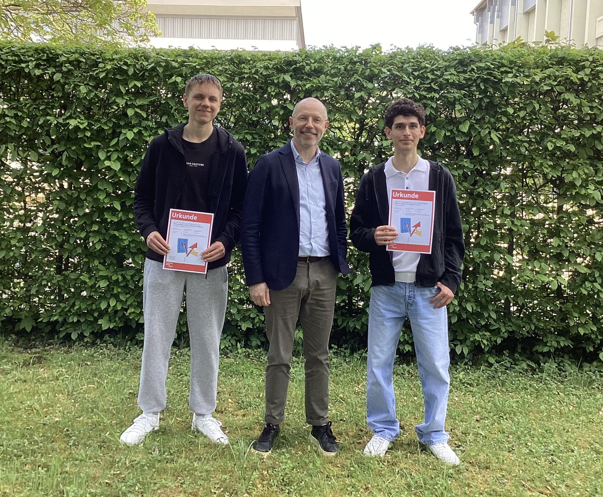 Danylo Danilenko und Efkan Kör (Klasse 10c) belegten den 3. Platz und konnten ihr Wissen über die Funktionsweise an der Börse gewinnbringend anwenden. Sie erhielten neben einer Urkunde einen Warengutschein im Wert von 20,- €.