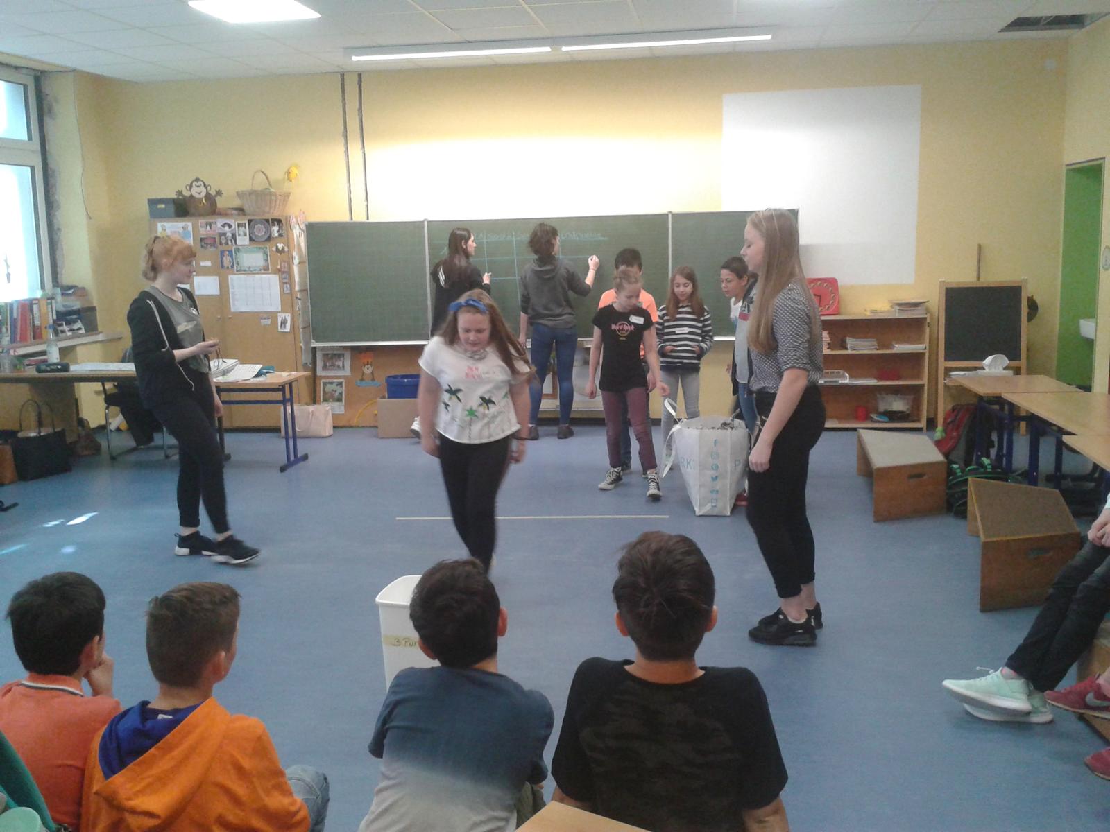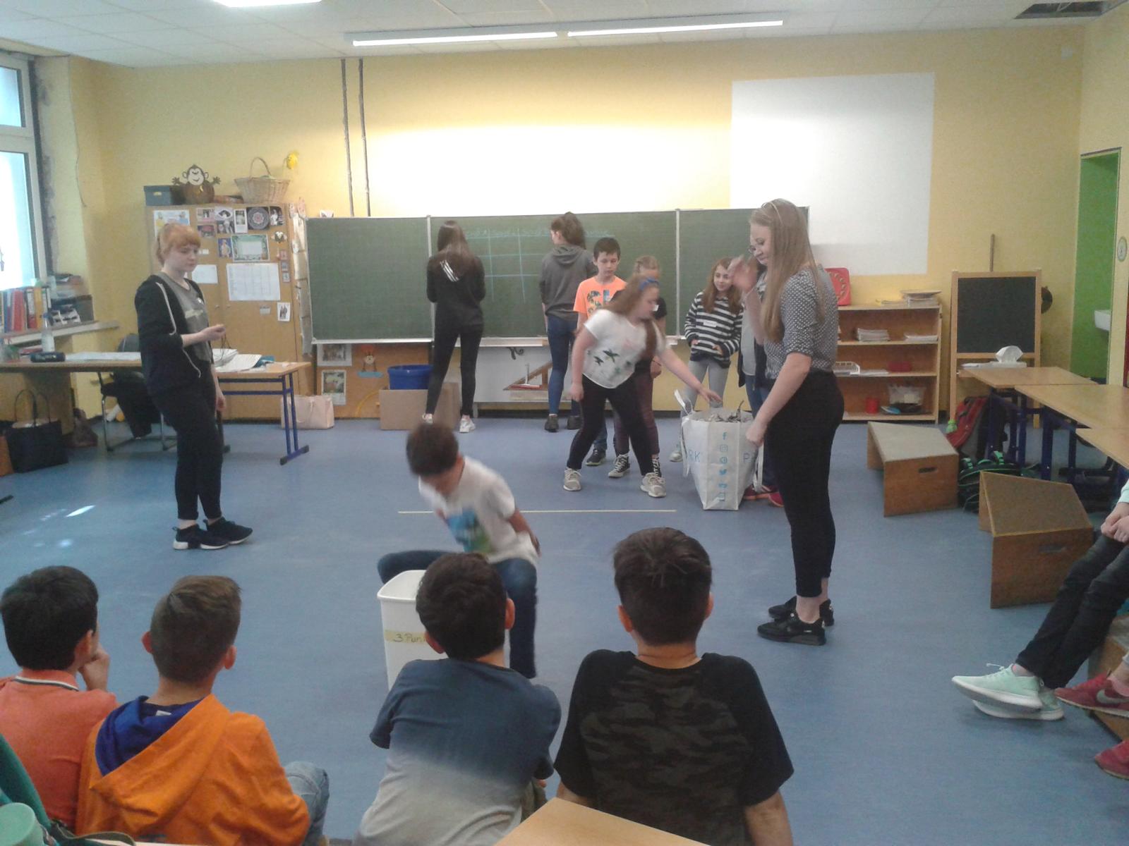 Für die Schüler unterrichten Schüler – AG war damit ihre „Hilfslehrertätigkeit“ aber noch nicht zu Ende, denn das nächste Projekt war für Dienstag, 05.06.18 terminiert. Hierbei ging es um einen Klassentag der 5d, für den die Schüler eine Schatzsuche vorbereitet hatten. In vorher durchgeführten Spielen konnten die jeweiligen Gewinner Hinweise erhalten, die ihnen die Schatzsuche erleichterten. Nach den Spielen ging es dann im Eiltempo ans Suchen des Schatzes, der auch problemlos gefunden werden konnte und sich als „süße Überraschung“ entpuppte.